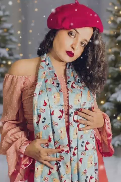 This Santa Claus printed satin scarf will drape beautifully and can be tied in a vast array of styles. This light weight, super smooth and so very pretty stole/scarf will be your go to accessory for the holiday season.