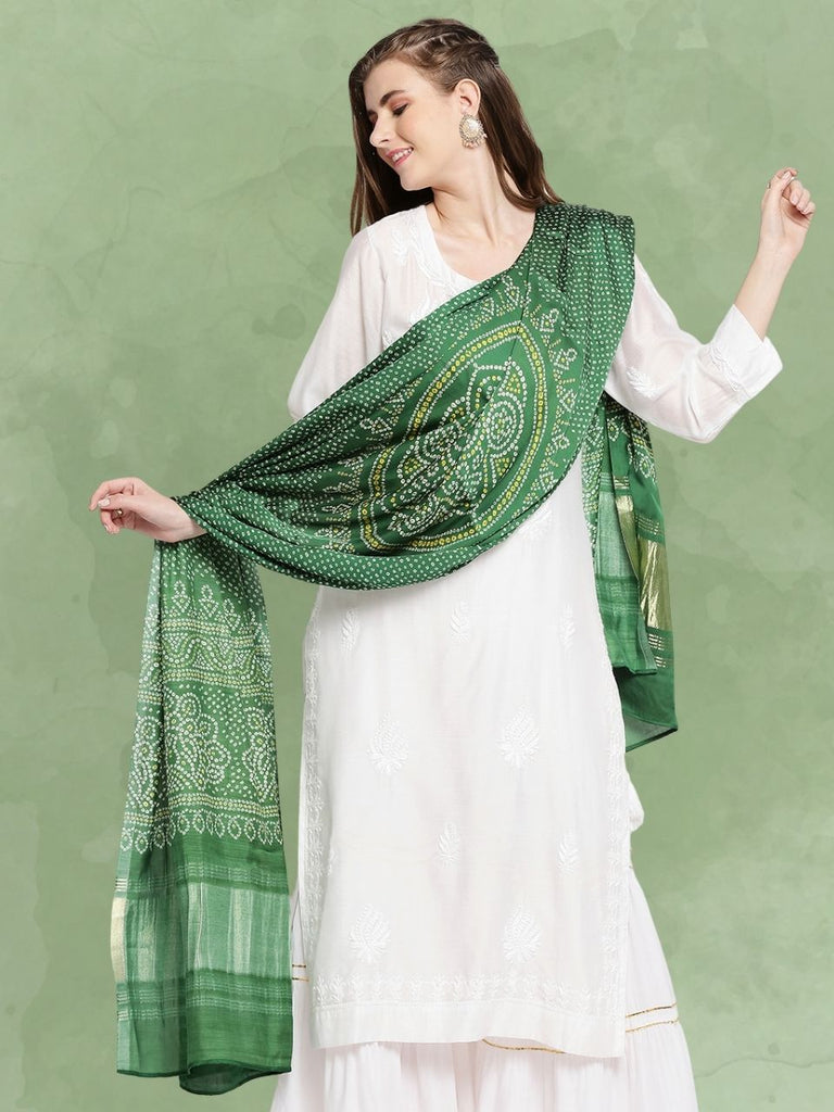 Rich & regal, this super smooth Bandhini printed Modal Silk dupatta from the house of Dupatta Bazaar would be a stunning and versatile addition to your ethnic wardrobe. This Soft dupatta is adorned with beautiful gold border.